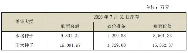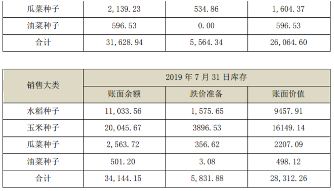 主要庫存種子品種有水稻、玉米、瓜菜、油菜,其中水稻、玉米的賬面余額、跌價準備和賬面價值均較去年同期有所下降。