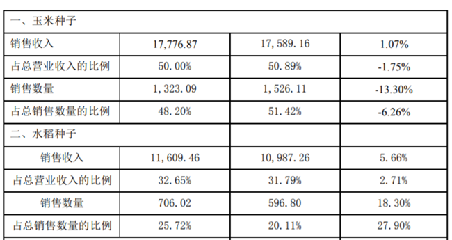 營業收入排名前五的業務大類分別是:玉米、水稻、瓜菜、小麥、綠肥種子。與去年同期相比,水稻的銷售收入增長5.66%,占總營業收入的比例增加2.71%;玉米的銷售收入增長1.07%,占總營業收入的比例下降1.75%。