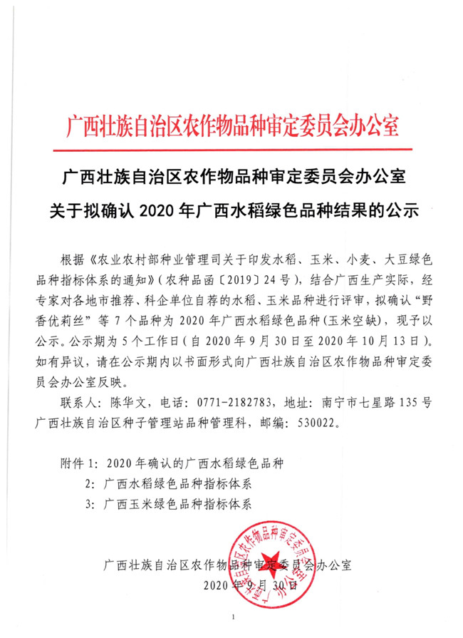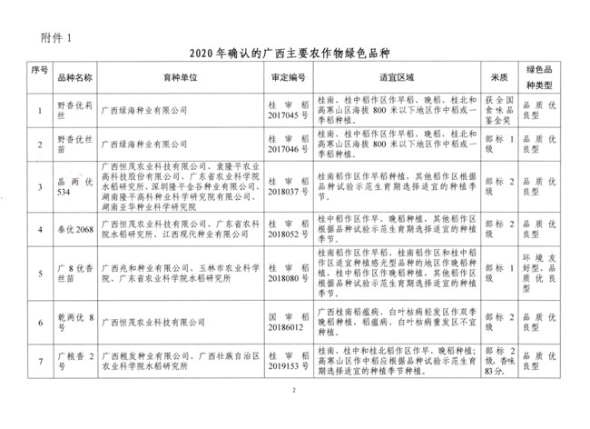 廣西壯族自治區擬確認2020年水稻綠色品種公示