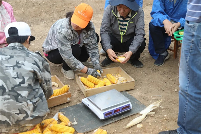 與會專家對河南省鶴壁市淇濱區劉寨村種植的15畝玉米新品種“中玉303”示范田進行籽粒實收測產,在5300株/畝密度下,實收畝產1060.76 公斤(14%水分折算)。