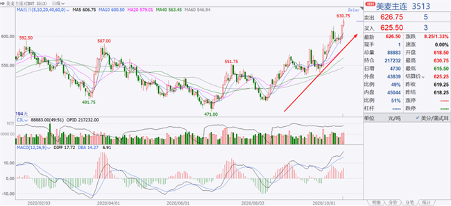 10月16日,CBOT軟紅冬小麥12月合約報收625.25美分/蒲式耳,漲至近六年最高水平,因市場持續擔心阿根廷、俄羅斯和美國大平原地區的干燥天氣威脅到小麥供應前景。8月份以來美麥主力合約累計上漲18%。