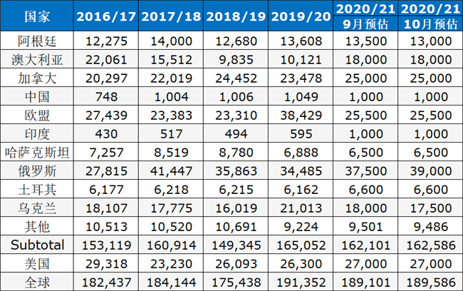 由于干燥天氣影響阿根廷小麥,2020/21年度迄今為止歐盟和英國的軟小麥出口量比上年同期減少近30%,而8月份英國的小麥進口量同比增加45%。目前國際谷物理事會(IGC)預計2020/21年度全球小麥期末庫存為6.289億噸,但是考慮到上述分析,未來幾個月該庫存數據有可能下調。
