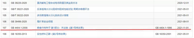 第1部分:禾谷類《第1號修改單》,實施日期為2021年11月1日。《修改單》對糧食作物種子國家標準部分內容作出修改,具體如下: