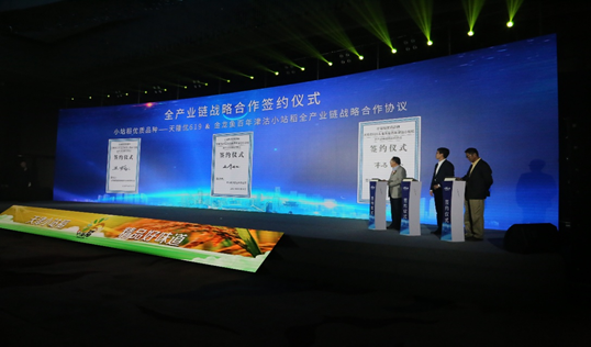 2018年以來,天津市連續三年舉辦小站稻產業大會,吸引了全國水稻領域著名專家學者和知名企業參與,成功打造了推動天津小站稻產業振興的賦能新平臺和向廣大人民群眾匯報小站稻振興成果的展示平臺。本屆推介會進一步推動了“優質品種+標準種植+品牌營銷”的全鏈條產業融合,成果豐碩:一是突出品牌影響力,首次推出優質小站稻宣傳LOGO和宣傳標語,把“津原U99”、 “金稻919”、“天隆優619”、“津川1號”四個優質小站稻品種逐步打造成“皇冠上的明珠”。二是突出品質把控力,依托天津食品集團、嘉里糧油、中化集團、海墾等大型龍頭企業,構建產加銷閉環經營模式,全程精細化管控確保產品品質。三是突出品種出新力,推出了第二批優質品種——“金稻919”,不斷豐富優質品種資源,為小站稻產業振興提質增效提供動力引擎。四是突出科技創新力,力邀萬建民、李家洋、胡培松等院士團隊傾力助陣,研究水稻領域前沿科技成果,確保產業發展高水平推進。五是突出文化傳承力,不斷拓展文化傳播功能,有效挖掘整理一批文旅作品及非物質文化遺產,助力小站稻金字招牌更加璀璨奪目。六是突出風險抵抗力,推出菜單式承保新模式,通過一站式服務將小站稻從種到收生產全過程的風險點全部納入風險保障范圍,筑牢生產基礎。七是突出市場驅動力,持續優化營商環境,一批重量級合作項目集中簽約落地,“小站稻電商平臺”成功上線,為小站稻產業騰飛打下堅實基礎。八是突出政府服務力,組織產加銷各環節主體開展高水平精準對接,打通從田間到餐桌的渠道通路,為實現互利共贏做好服務。