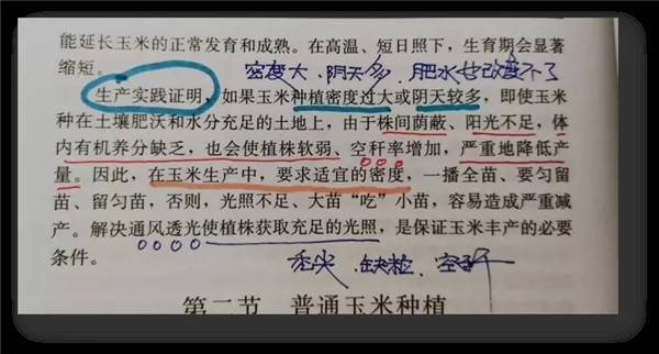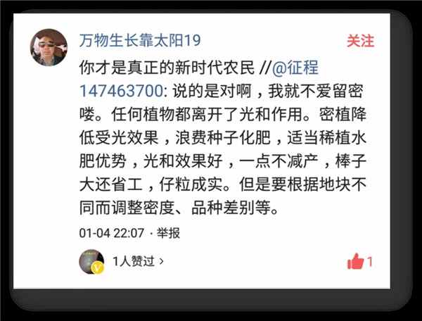 如下圖某讀者評論:“我就不愛留密,(因為)密植降低受光效果,浪費種子化肥”;“適當稀植水肥優勢(大),光合效果好,一定不減產,棒子大還省工,籽粒飽實(籽粒沉,容重高)”。