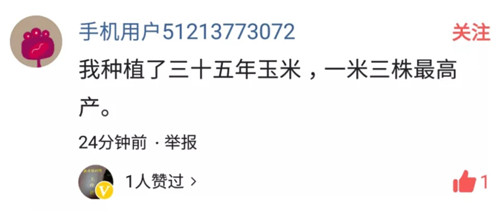 ↓圖3,某讀者的評論:我種植了35年玉米,一米三株最高產。