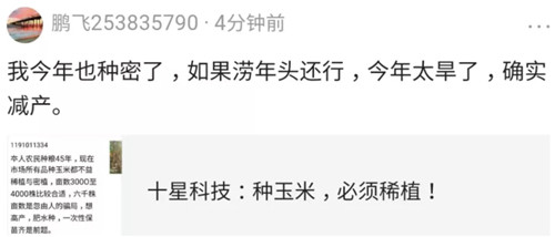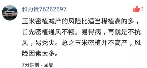 ↓圖4,某讀者評論:玉米密植減產的風險高的多”;“易得病,不抗風,容易禿尖。