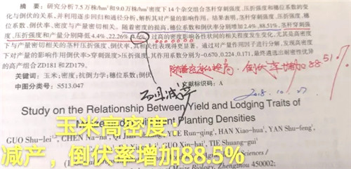 ↓圖1,河南省農科院郭書磊博士科研結果證明:玉米高密度種植,倒伏率增加88.51%且減產——基本上是“十密九倒”。