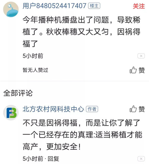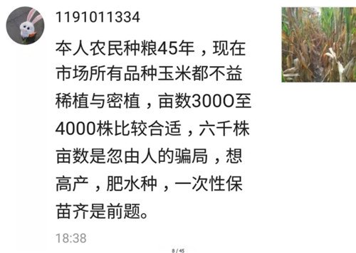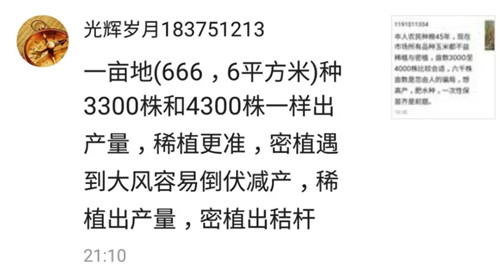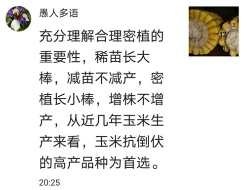 ↓圖8,某讀者評論:稀苗長大棒,減苗不減產;密植長小棒,增株不增產;抗倒伏為首選。