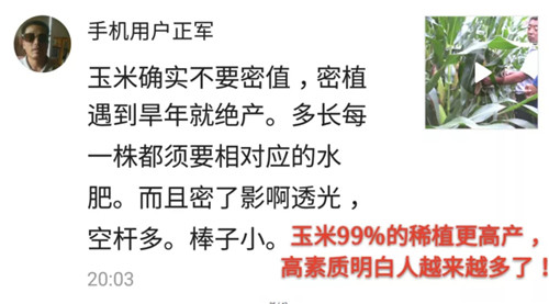 ↓圖11,某讀者評論:玉米確實不要密植。密植遇到旱年就絕產。多長每一株都需要相對應的水肥。而且,密植影響透光,空稈多,棒子小。
