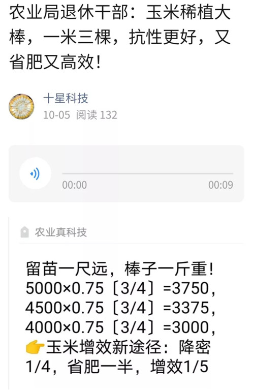 ↓圖16,河北某農業局退休干部呂發和先生,這幾年一直在推廣超級玉米品種——國審“八強十號”(國審玉20190254),他深深領悟到“留苗一尺遠,棒子一斤重”。實現了“降低密度1/4,省肥一半,增效1/5”,你聽錄音,他在幾秒的時間了連續說了3遍的“一米三棵苗”,這是多么深刻的領悟啊!【附錄音】。