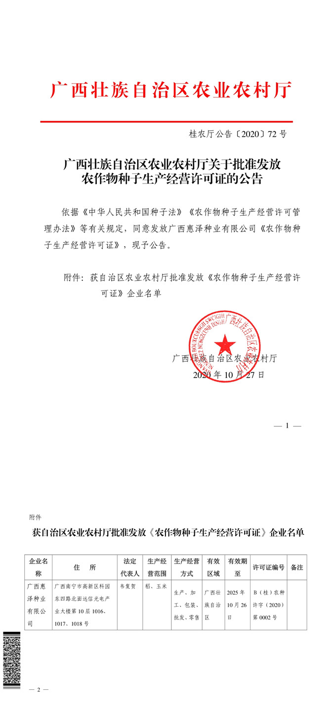 廣西:關于批準發放農作物種子生產經營許可證的公告