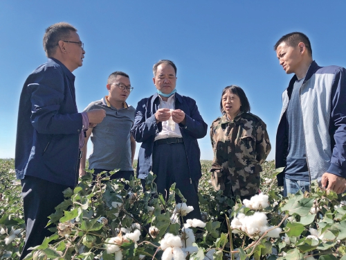 圖為張西嶺(中)、時增凱(左一)、宋美珍(右二)等專家在新疆昌吉中棉所試驗基地考察“寬早優”模式和推廣示范的“中棉所113”新品種。 資料圖