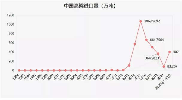海關總署最新發布10月糧食進出口數據,其中高粱進口跳增很大,前10月中國累計進口量達到402萬噸,同比增加449.2%,引起了市場高度關注。