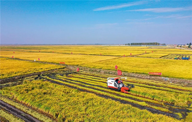 9月27日,農民操作機械在興安盟袁隆平院士工作站鹽堿地水稻基地收獲水稻。 徐欽攝