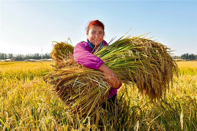 9月25日,在新疆岳普湖縣“海水稻”種植基地,管理員布合麗切木• 沙迪爾在運送成熟的水稻。高晗攝