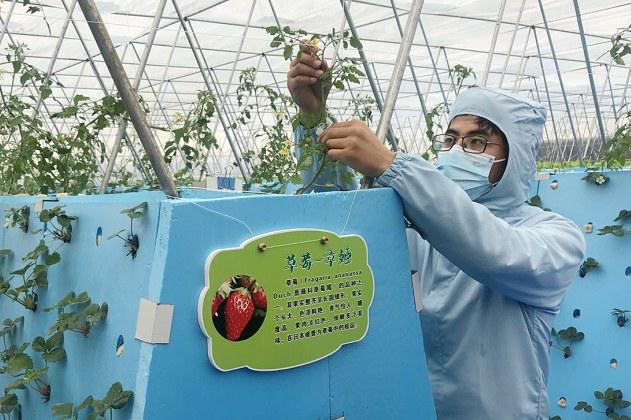 技術(shu)人員查看草(cao)莓長勢(shi)