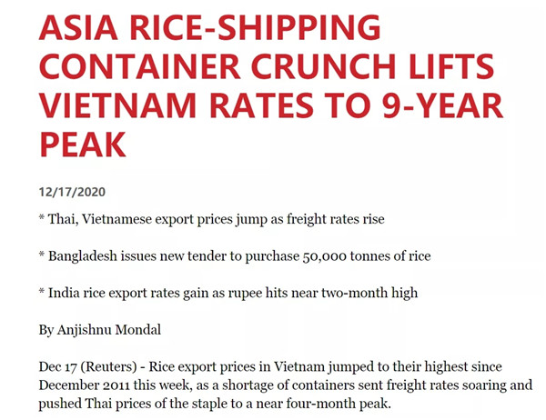 一位貿易商稱,集裝箱短缺使得貿易商很難向客戶裝運大米。例如對非洲的20英尺集裝箱運費從數月前的1500美元漲至5000美元。