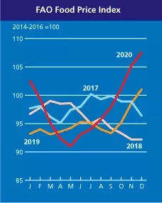 2020年全年來看,聯合國糧農組織谷物價格指數平均為102.7點,較2019年上升6.4點(6.6%),創2014年以來的年均指數新高。緊縮的供應和強勁的需求推高了小麥和玉米價格,與2019年相比分別上漲5.6%和76%。大米在2020年的全球進口需求疲軟,但出口價格仍然比低迷的2019年增高8.6%,創六年內的新高。而原因主要是有些出口國產量受限;在2020年第二(er)季(ji)度,部分供(gong)應方實(shi)施臨時出口(kou)限制,又加劇了供(gong)應的挑戰(zhan);此外(wai),物(wu)流的瓶頸也有影(ying)響(xiang)。