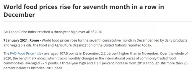 聯合國糧農組織(FAO)1月7日表示,2020年12月,世界糧食價格錄得連續第七個月上漲,谷物、植物油、乳制品等除糖以外的所有主要類別12月均出現上漲。