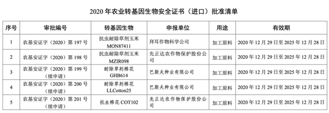 作物的生物安全證書(進口)用于加工原料。5個產品證書包括:拜耳(抗蟲耐除草劑