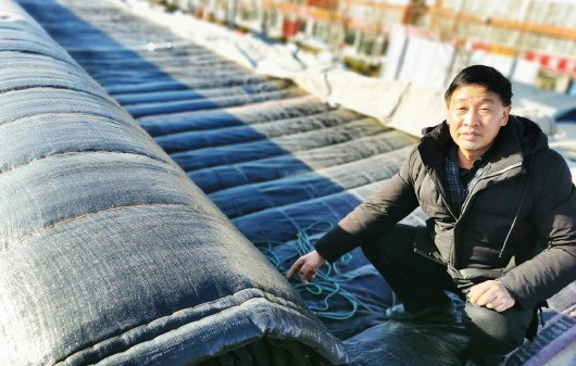 “最早的大棚蓋的是草簾子,現在換成了新式太空棉被。”目前應用的新型大棚棉被,具有防雨、防雪、防風、保溫效果好等多重優點。由于棉被最外層是防水黑色膜,容易吸收熱量,落雪后會很快融化,避免了掃雪的辛苦。“現在用自動卷簾開關,10分鐘就能把棉被全部蓋好。”