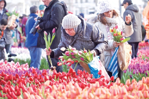 在荷蘭阿姆斯特丹,人們在水壩廣場采摘郁金香。 西爾維婭·萊德雷爾 攝 新華社發