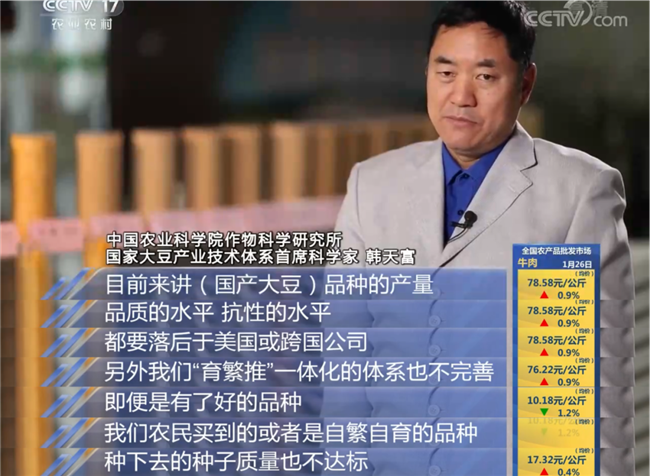 ▲ 中國農業科學院作物科學研究所韓天富研究員介紹國產大豆育種現狀 | 來源:CCTV-17中國三農報道