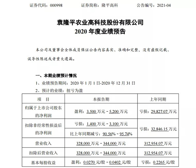 近日,袁隆平農業高科技股份有限公司(下稱“隆平高科”)發布2020年度業績預告,預計2020年度凈利潤為3500萬元-5200萬元,上年同期虧損2.98億元,同比增長111.73%-117.43%,實現扭虧為盈;扣除非經常性損益后的凈利潤為虧損1400萬元-3100萬元,上年同期則為虧損3.28億元。