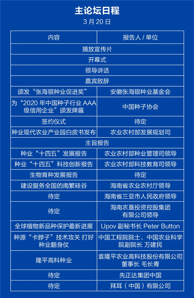 3月20日舉辦主論壇;3月21日平行舉辦水稻產業鏈發展論壇、玉米產業鏈發展論壇、蔬菜種業發展論壇、海南自由貿易港種業發展論壇、南繁產業發展論壇、數字種業論壇(上午)、果樹種業論壇(下午),3月22日平行舉辦種業知識產權保護論壇、“十四五”中國畜禽種業創新發展論壇、水產南繁種業發展論壇、農墾種業論壇、現代種業產業園新聞及政策發布會(上午);3月23-24日,在三亞市、陵水縣、樂東縣分別舉辦農作物品種田間展示,在三亞崖州灣科技城安排參觀活動;會議期間,還將舉辦室內展覽展示和產業對接活動。