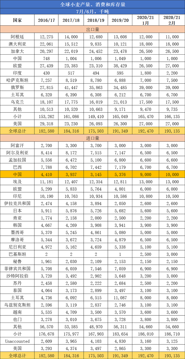 美國農業部表示,受非食用小麥消費增長的推動,中國小麥進口預估已連續第六個月上調,預計2020/21年度中國非食用小麥使用量將達到創紀錄的3000萬噸,較去年增加1000萬噸,并將超過2012/13年度的水平——2600萬噸。