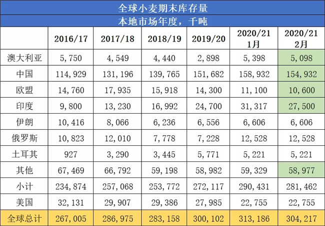 根據美國農業部的報告,2020/21年度全球小麥庫存從此前的預估大幅削減約900萬噸,至3.0422億噸。