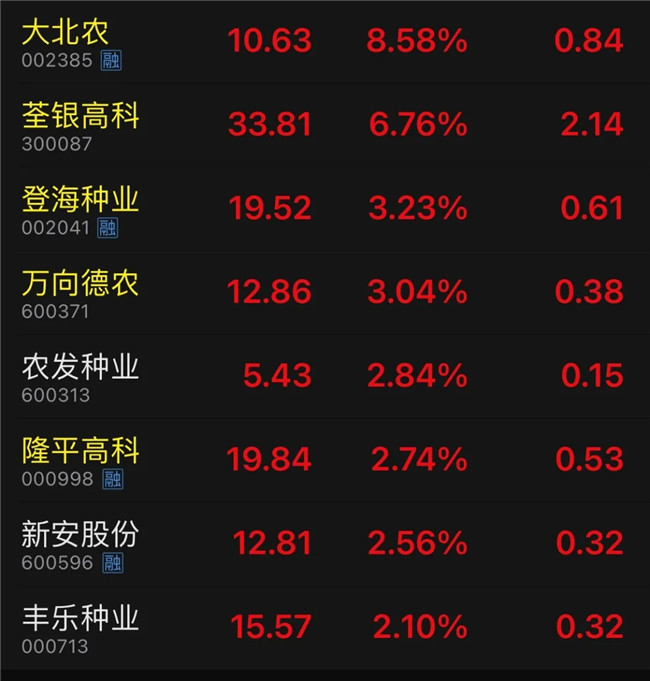 個股方面,種業板塊內10只成份股全線飄紅,神農科技領漲,漲幅超過15%,緊隨其后的大北農、荃銀高科等個股漲幅在6%以上。
