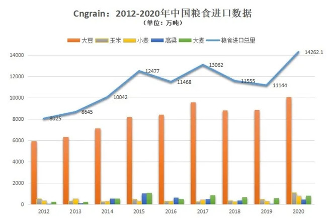 此外,我國以玉米為代表的飼料糧進口正在大幅增加。2020年我國糧食進口創歷史新高,累計進口超1.4億噸,其中將近80%的農產品進口用于發展養殖業的飼料。進口規模最大的三個品種分別是大豆1億噸、玉米1130萬噸、小麥838萬噸,玉米和小麥突出增長,分別為135%、140.2%。