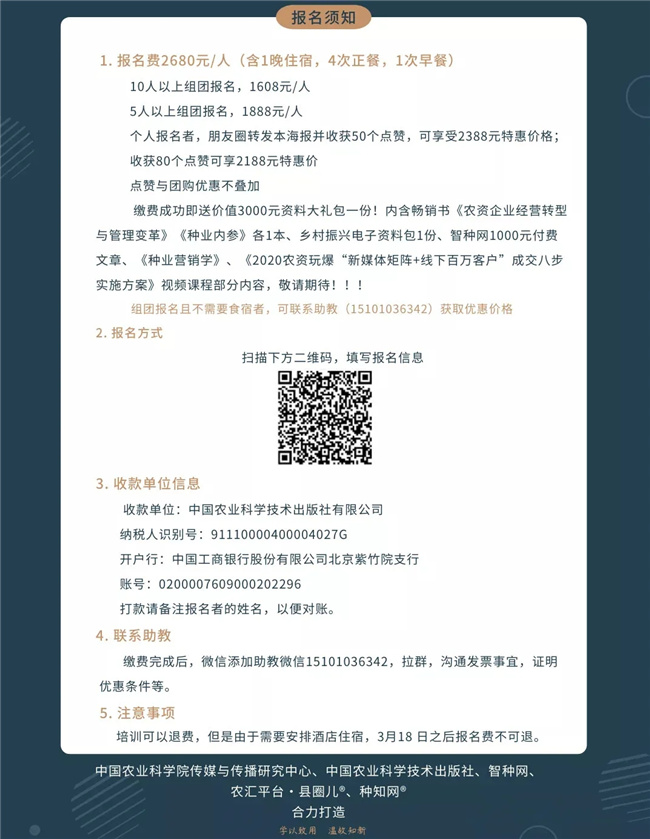 1.報名費2680元/人(含1晚住宿,4次正餐,1次早餐),10人以上組團報名,1608元/人,5人以上組團報名,1888元/人。