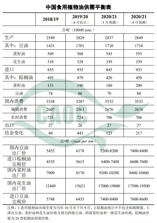 本月對2020/21年度中國大豆供需形勢預測與上月保持一致。國內方面,大豆主產區春耕在即,新季大豆種植面積可能減少,加之大豆種植地租等成本增加,支撐國產大豆價格高位運行,預計全年國產大豆銷區批發均價區間為每噸4575-4775元,比上月預測提高300元。國際方面,美國農業部(USDA)發布季度谷物庫存報告和種植意向報告,美豆庫存同比降低,種植面積增幅低于市場預期,引發美豆期貨價格上漲,加之全球貨幣超發,預計國際大豆價格高位震蕩。