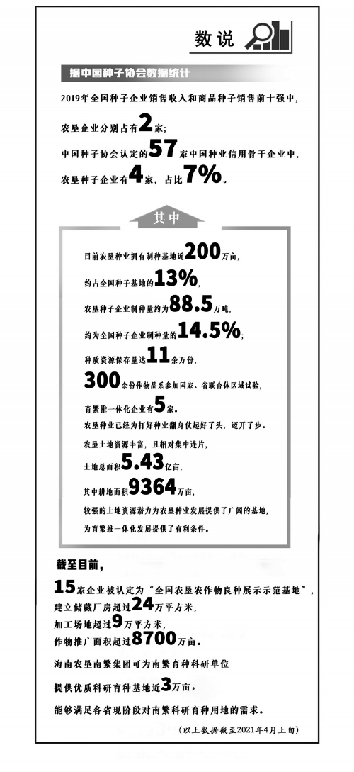 農業現代化,種子是基礎。保障糧食安全,種子是要害。農墾是保障國家糧食安全和重要農產品有效供給的國家隊和中國特色新型農業現代化的示范區。據中國種子協會數據統計,2019年全國種子企業銷售收入和商品種子銷售前十強中,農墾企業分別占有2家;中國種子協會認定的57家中國種業信用骨干企業中,農墾種子企業有4家,占比7%。中國農墾經濟發展中心主任李尚蘭在論壇致辭中指出,近年來,農墾種業企業以新發展理念為引領,不斷塑造農墾種業品牌,不斷促進企業壯大實力,在推進育繁推一體化、種業大基地建設、企業聯合、聯營、聯盟等方面取得了一定的成效。目前農墾種業擁有制種基地近200萬畝,約占全國種子基地的13%,農墾種子企業制種量約為88.5萬噸,約為全國種子企業制種量的14.5%;種質資源保存量達11余萬份,300余份作物品系參加國家、省聯合體區域試驗,育繁推一體化企業有5家。農墾種業已經為打好種業翻身仗起好了頭、邁開了步。