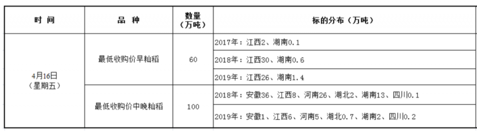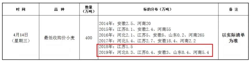 4月14日最低收購價小麥拍賣,2019年小麥投放增加至9.5萬噸,分別為河北0.3萬噸,江蘇0.4萬噸,安徽3萬噸,山東0.4萬噸,河南5.4萬噸。