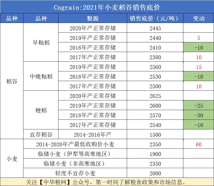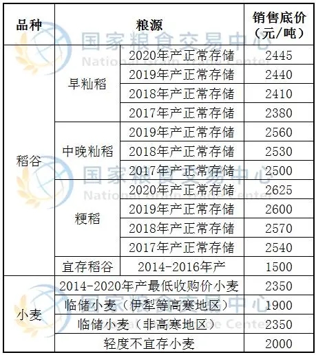接國家有關部門通知,自2021年4月12日開始銷售的最低收購價稻谷、最低收購價小麥、國家臨儲小麥的銷售底價明確如下: