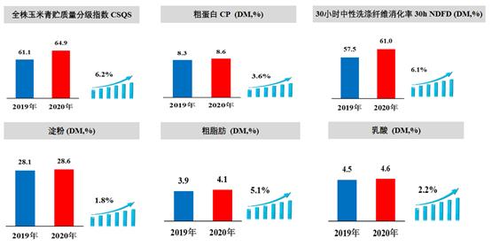 報告顯示,按照全株玉米青貯質量分級指數(CSQS)評價,2020年我國CSQS平均值為64.9分,同比提高6.2%,30小時中性洗滌纖維消化率、淀粉含量和乳酸含量平均值比2019年分別提高了6.1%、1.8%和2.2%。糧改飼試點地區90%以上全株玉米青貯質量達到良好水平,比2019年提高5個百分點,其中17.5%達到優秀水平,比2019年提高8.5個百分點。