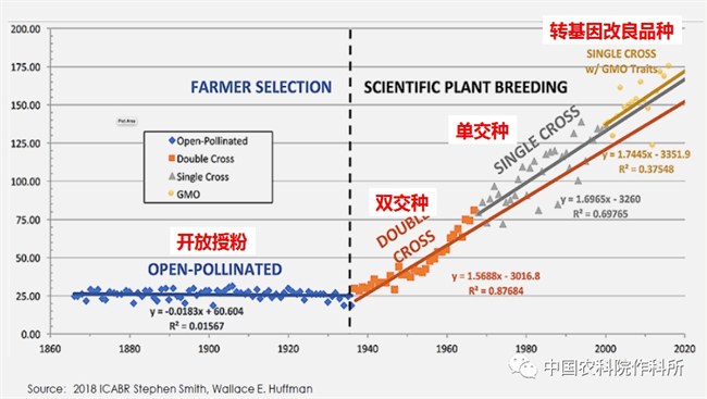 國外正式的玉米育種經歷了混合選擇改良、雜交育種和轉基因育種等階段。