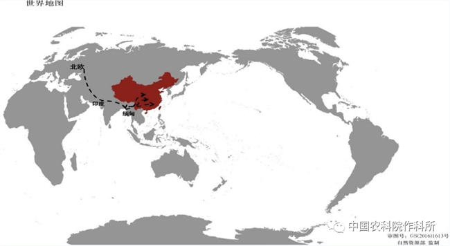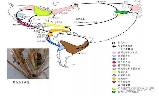 圖1玉米的起源(馴化)中心及可能的傳播路徑(引自Vigouroux, et al. 2008)