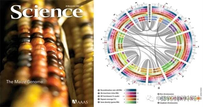 育種基礎理論創新是驅動玉米育種技術進步的源泉。隨著以基因組為核心的多重生物組學不斷深入,高通量基因型鑒定技術與分析方法的發展,以及合成生物等前沿學科的興起,在玉米重要性狀形成的關鍵功能基因及分子機理研究上不斷取得突破。2009年以美國依阿華州立大學和冷泉港實驗室等主導發布了以自交系B73為背景的首個玉米參考基因組(圖11),到現在已經更新到第五版。隨著高通量測序技術的快速發展,目前超過25個材料的全基因組數據被陸續報道并釋放。基于B73參考基因組信息,以康奈爾大學為首的實驗室已經對數千個玉米自交系進行了重測序,豐富了玉米序列和結構變異信息。這些基因組信息將會極大地促進玉米遺傳多樣性、遺傳變異和表型變異的關聯和玉米改良的研究,奠定了玉米功能基因組研究的平臺,加速了對涉及玉米產量、農藝、抗病和耐非生物脅迫等功能基因克隆及其分子機理的研究,推動玉米全基因組選擇、單核苷酸多態性(SNP)育種芯片等分子育種方法與技術進步。