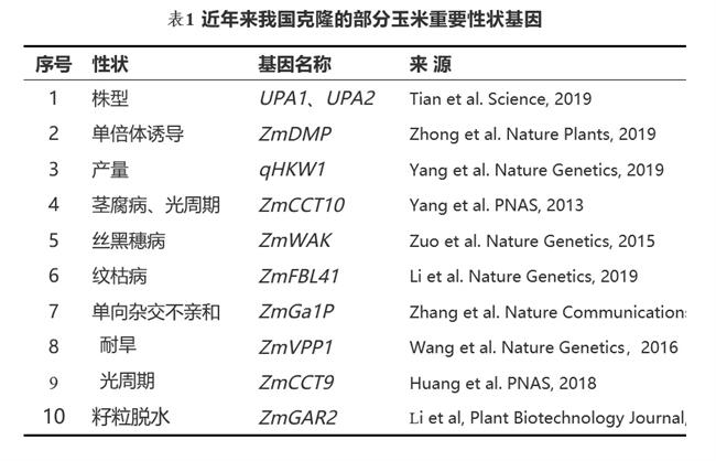3.玉米前沿基礎和核心技術取得重大進展,顯著提升原始創新能力。我國科學家牽頭組織對玉米自交系Mo17、SK、mexicana和黃早四進行基因組測序與組裝,分析其基因組變異特征,其中Mo17和SK組裝質量較高,成為國際上玉米基因組研究的代表。挖掘出一批控制產量、株型、抗病、抗旱等重要性狀的關鍵基因(表1),解析了其基因功能及相關性狀形成的分子機制,促進了玉米品種改良方法和理論進步。