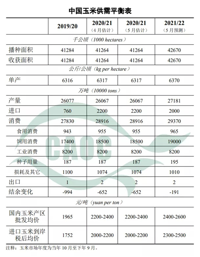 本月預測,2021/22年度,中國玉米種植面積42670千公頃(6.40億畝),較上年度增加1406千公頃(2109萬畝),增長3.4%,主要是玉米種植收益較好,農民擴種積極性高,東北產區大豆、甜菜等品種改種玉米意愿增強。春播期間大部分產區土壤墑情好于上年,再加上品種改良、技術進步等因素,預計玉米單產將達到每公頃6370公斤(每畝425公斤),較上年度增長0.8%;玉米總產量2.72億噸,比上年度增長4.3%;需求方面,生豬產能繼續恢復,將拉動玉米飼用消費增加,但考慮到畜禽養殖飼料配方調整,玉米替代品比例提高,以及玉米價格高位運行對深加工需求有所抑制,玉米總需求增速將有所放緩,預計玉米總消費為2.94億噸,較上年度增長1.6%;本年度玉米產需缺口將縮小至2189萬噸。