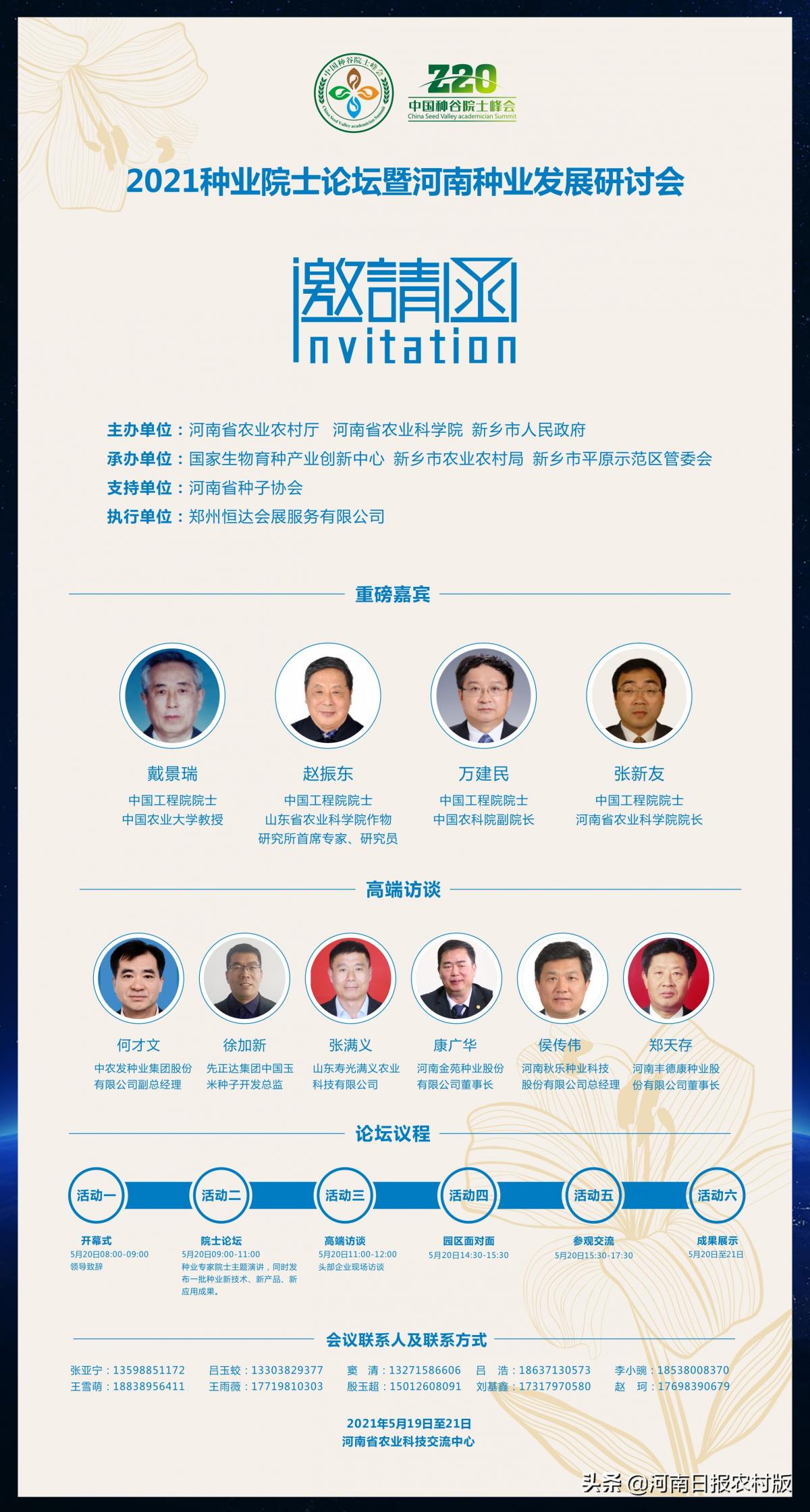 (二)院士論壇。定于5月20日9:00在河南省農業科技交流中心報告廳舉行,邀請戴景瑞院士、趙振東院士、萬建民院士和張新友院士做種業發展主題報告。