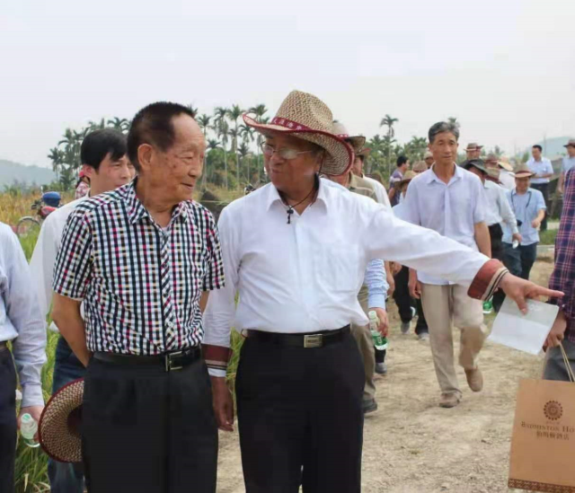 2013年4月10日,袁隆平院士(左)與謝華安院士(右)在福建南繁育種基地觀摩。
