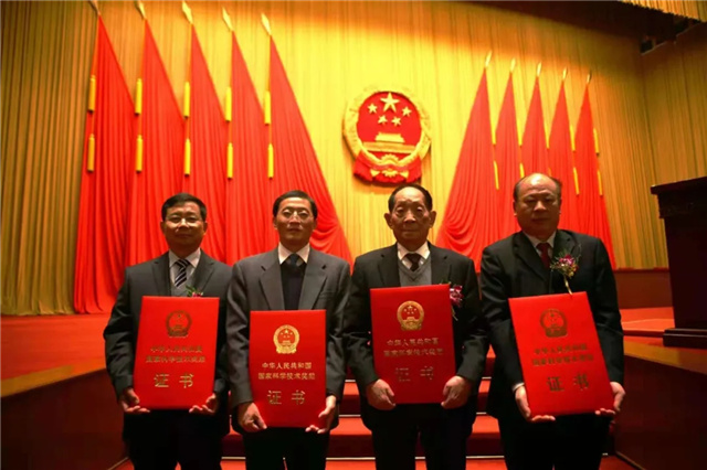 鄧華鳳(左二)同恩師袁隆平先生(右二)一起獲得國家科技進步特等獎,在北京領獎時合影。