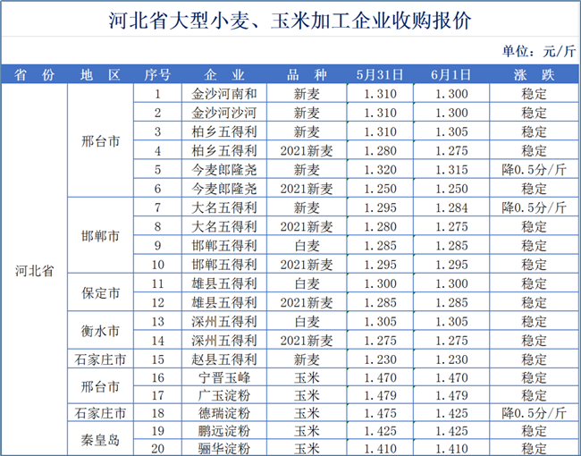 目前河北陳麥價(jia)格(ge)基本穩定(ding),新麥收購價(jia)格(ge)回落空間也(ye)比(bi)較小(xiao)。