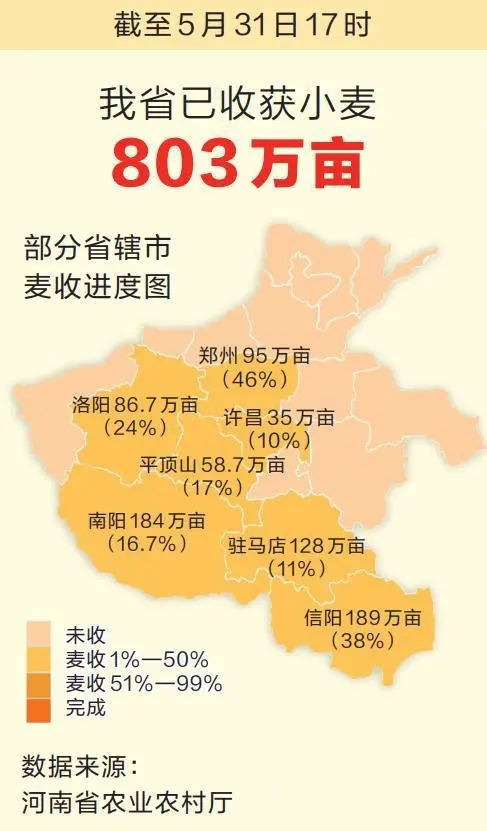 其中,鄭州收獲了95萬畝,信陽收獲了189萬畝,洛陽收獲了86.7萬畝,平頂山收獲了58.7萬畝,南陽收獲了184萬畝,駐馬店收獲了128萬畝,許昌收獲了35萬畝。